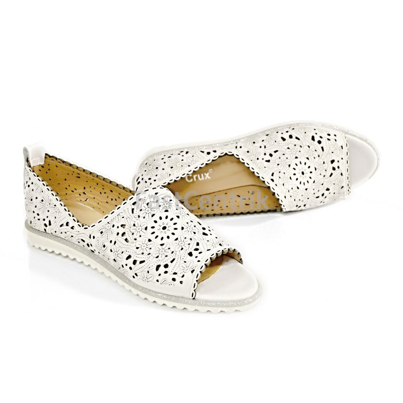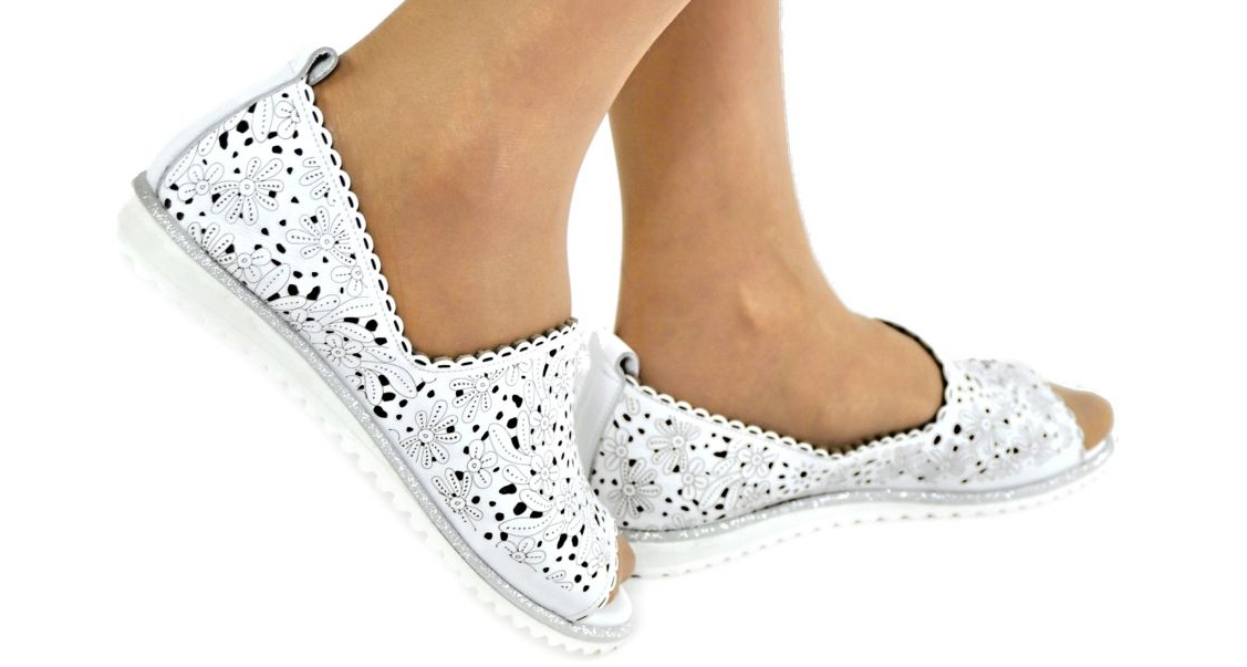 Svršek je velmi kvalitní jemná bíla kůže s perforací a florálním potiskem, špička je volná, na nártu je šikmý tvar, po horním obvodu a u špičky je zoubkování na zápatí je pata zpevněná hladkou bílou kůží se zvýšeným přesahem do poutka tvarovaná béžová kožená stélka je měkká boční stranu bílé podešve tvoří zoubky na spodku jsou příčné pruhy výška podešve vpředu cca 2 cm, pod patou cca 1,5 cm