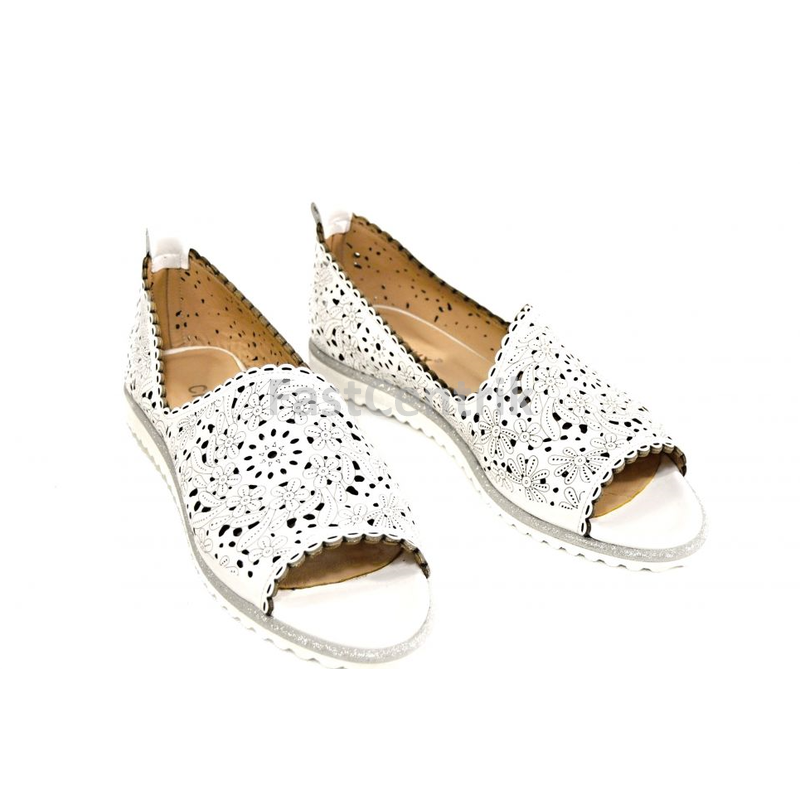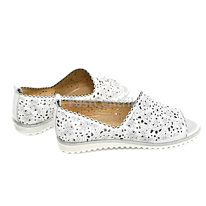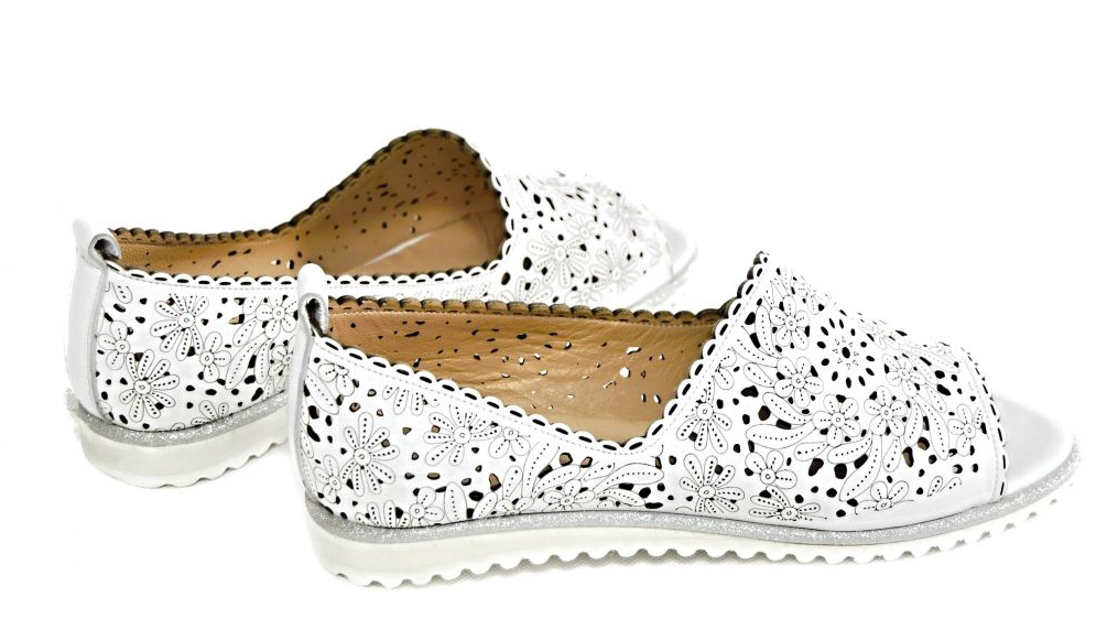 svršek je velmi kvalitní jemná bíla kůže s perforací a florálním potiskem, špička je volná, na nártu je šikmý tvar, po horním obvodu a u špičky je zoubkování na zápatí je pata zpevněná hladkou bílou kůží se zvýšeným přesahem do poutka tvarovaná béžová kožená stélka je měkká boční stranu bílé podešve tvoří zoubky na spodku jsou příčné pruhy výška podešve vpředu cca 2 cm, pod patou cca 1,5 cm