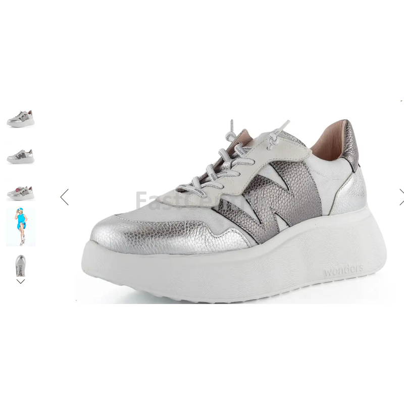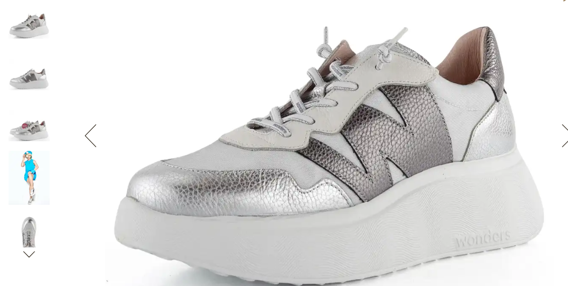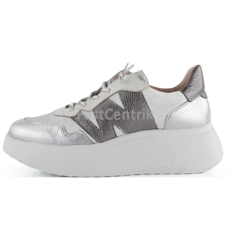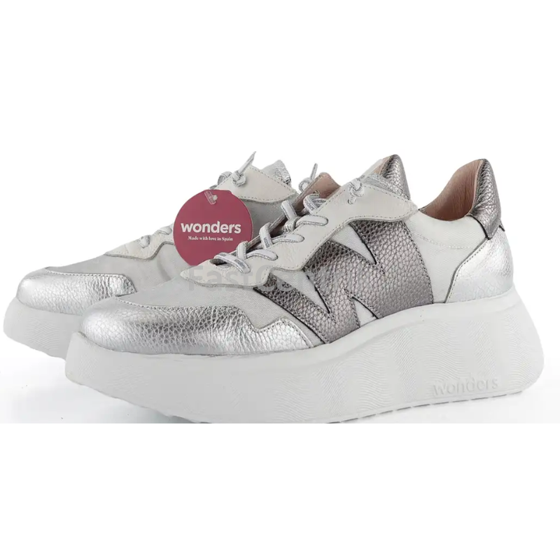 Dámské stylové prozouvací polobotky/tenisky na platformě od španělské značky Wonders. kulatý tvar špičky svršek vyroben ze strukturované kůže v kombinaci s textilií základ tvoří světle šedá barva textilie doplněná smetanovou a metalickými odstíny stříbrné a olověně šedé barvy kůže stříbrně lemované, pružné šněrování zakončené uzlíky uvnitř převážně kožená podšívka, špička podšitá textilií zabroušený vnitřní opatek měkčený jazyk i patní lem příjemně měkká a vyjímatelná vložka ze syntetiky s výplní MemoryGel® vysoká odlehčená podešev s klínkem lepený výrobní způsob