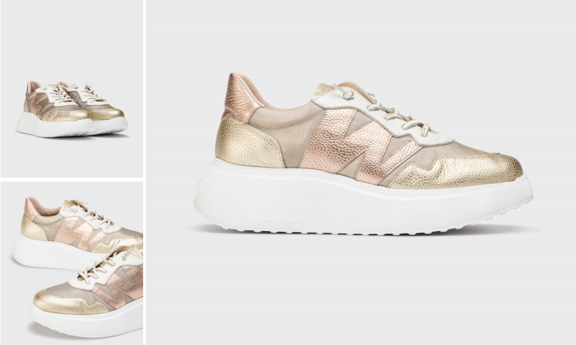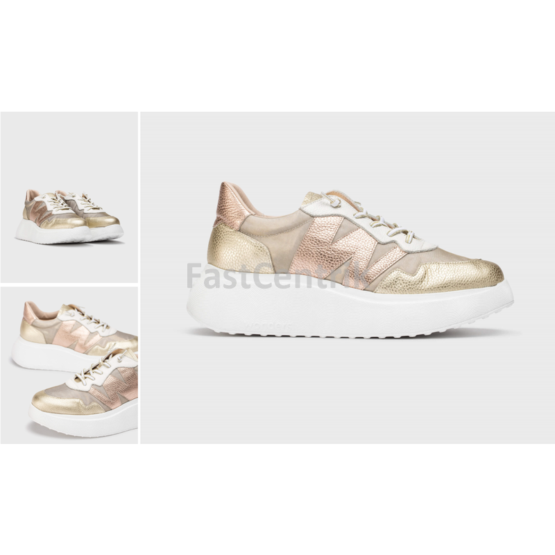 Dámské stylové prozouvací polobotky/tenisky na platformě od španělské značky Wonders. kulatý tvar špičky svršek vyroben ze strukturované kůže v kombinaci s textilií základ tvoří světle šedá barva textilie doplněná smetanovou a metalickými odstíny stříbrné a olověně šedé barvy kůže stříbrně lemované, pružné šněrování zakončené uzlíky uvnitř převážně kožená podšívka, špička podšitá textilií zabroušený vnitřní opatek měkčený jazyk i patní lem příjemně měkká a vyjímatelná vložka ze syntetiky s výplní MemoryGel® vysoká odlehčená podešev s klínkem lepený výrobní způsob