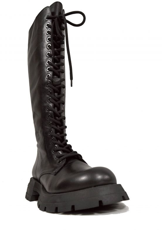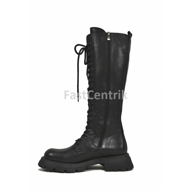 -svršek z kvalitní hladké matné kůže, interiér je zateplen velmi příjemným plyšovým materiálem, včetně měkké stélky. -klasické šněrování s černými kulatými tkaničkami, na vnitřní straně po celé výšce zip s kovovým jezdcem, pro snadné obouvání. -černá podešev cca 2,5 cm jemně pruží s hrubým vzorem, který je zdobný i z bočního pohledu, výška podpatku cca 4,5 cm, celková výška cca 42,5 cm.