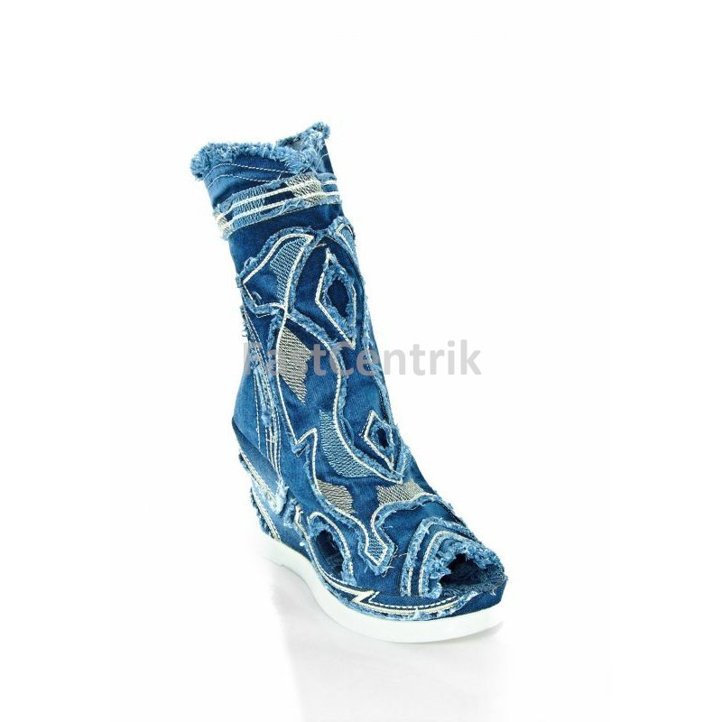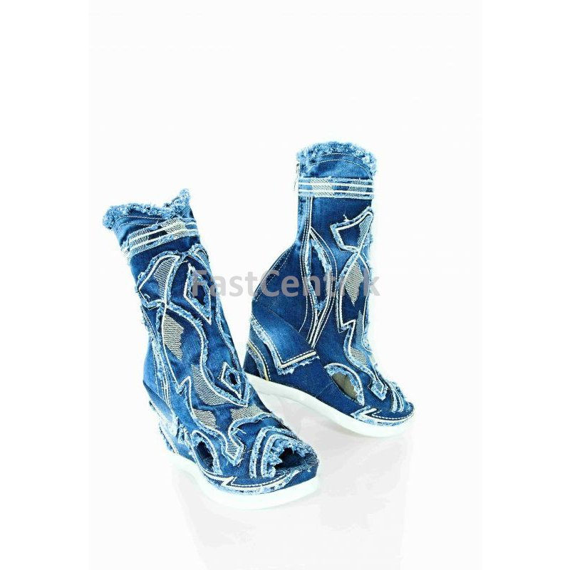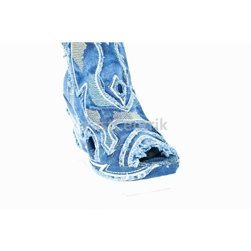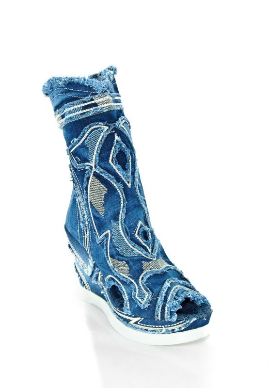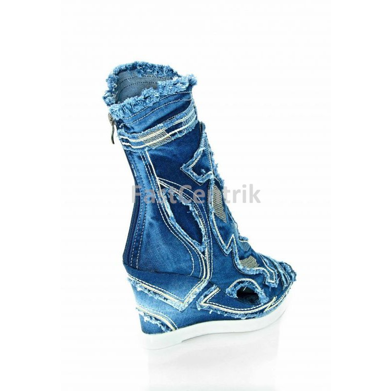 JEANS ,,džínoviny" velice kvalitní a příjmný materiál: -na zadní části zapínání na zip po celé výšce boty -třásně z ,,džínovin" zdobí horní lem i celé obě strany boty -měkká vložka umožní pohodlnou chůzi -vhodné na jarní a letní období -obuv na platformě cca. 4 cm -výška klínu cca. 12 cm ( vnitřkem skrytá) -celková výška 27 cm